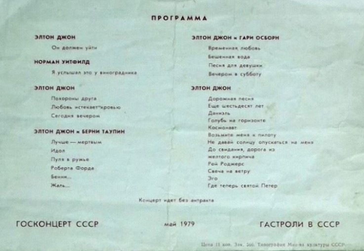 «- У моего друга был экспортный вариант приемника «ВЭФ» с частотами 13, 16 и 19 метров - в этом диапазоне «вражеские голоса» не глушились, и мы узнали, что Министерство культуры ведет переговоры с Элтоном Джоном о гастролях в СССР, – рассказывает Василий. - Вроде бы даже кто-то из высоких чинов сам побывал на концерте Элтона, чтобы убедиться в его безвредности для советской культуры. Мы в эти новости не очень поверили. Мне, впрочем, было все равно - я тогда жил в Барнауле, учился в инязе и, конечно, никуда ехать не мог, а потому попасть на концерт даже не мечтал. Но повезло: примерно в середине мая меня отправили в город Горький на Всероссийскую олимпиаду по английскому. Я ухватился за эту возможность и добрался до Москвы.» Кассы зала «Россия» для Василия Бурьянова, как и для всех остальных фанатов, были закрыты. На крохотной афишке с мутной фотографией Элтона Джона он мог прочитать только «Все билеты проданы». «Как я позже узнал, они (билеты) не очень-то и продавались, - продолжает Бурьянов, - достались только сотне-другой счастливчиков. Отец моего друга работал заместителем министра какой-то промышленности и достал ему билет на концерт. Ещё одному знакомому билет тоже принес отец - номенклатурный работник. А поскольку Москва кишела всяким начальством, простым людям рассчитывать было не на что. Я отправился в Ленинград. Площадь перед концертным залом «Октябрьский» выглядела иначе - было шумно, толпа бурлила, возле кассы выстроились в очередь простаки, надеявшиеся на продажу «брони». Билет я купил чудом. С рук. За 35-ть советских рублей.» Элтон Джон пробыл в Советском Союзе чуть больше недели. Решение о его приезде было принято на уровне отдела культуры ЦК КПСС. Элтону выделили «Чайку» из правительственного гаража, а из штата компании «Госконцерт» - тогдашнего монополиста в области зарубежных гастролей - тур-менеджера и по совместительству личного переводчика Наталью Михайловну Иванову.